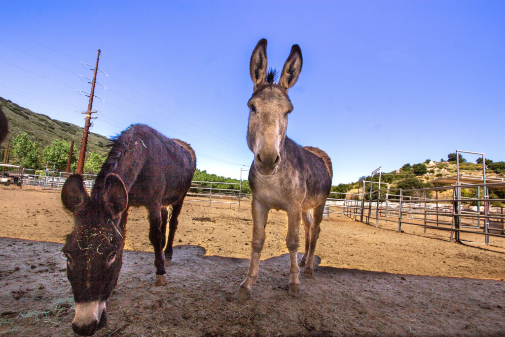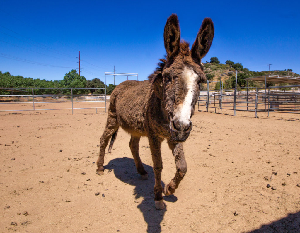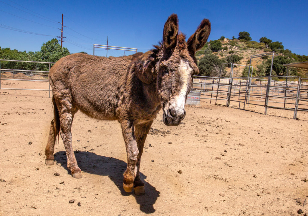 Ethel came into our care from the San Bernardino County Animal Care and Control. She arrived with Fred, of course. Fred is unusual in that he tends to have a hard time gaining and maintaining his weight. This is unusual for burros who generally gain weight easily. Ethel gains weight much to easily so she is not able to live with Fred. However, the two live right next door to each other and each lives with a group of burros. Ethel is a very friendly girl, as her name would suggest. We thought Don did a great job capturing her warm, friendly demeanor in these photos.
