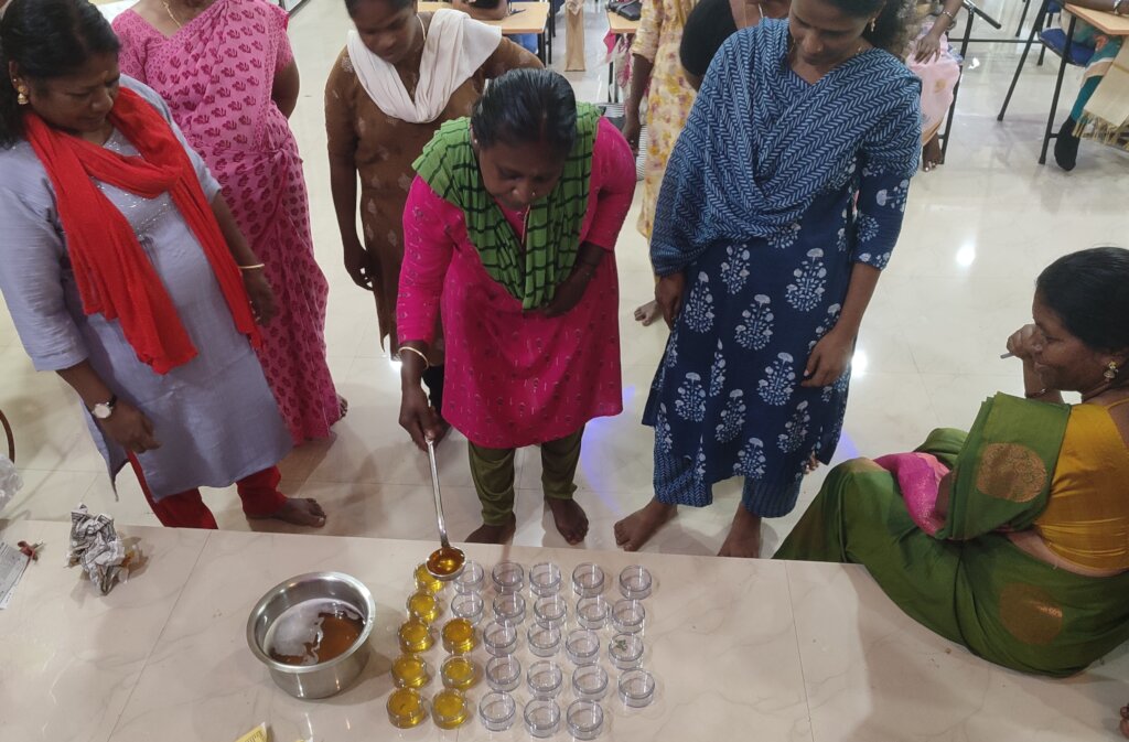 The second day focused on value addition and income diversification. Participants practiced hygienic honey processing, filtration, and storage, and learned to make beeswax- and honey-based products such as soaps, lip balms, body balms, and face packs. “Now we know how to make more from what we already have,” another participant said.