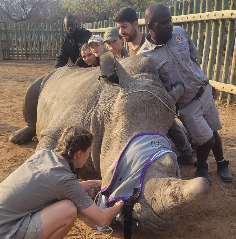 Along with Thaba, Bula, Peter and Mango, she underwent another dehorning procedure in October. While we would prefer never to have to take this step, it does offer an added layer of protection when it comes to keeping rhinos safe from poachers. Esmé was a superstar and was back to her usual self in no time. The dehorning procedure involved darting her to sedate her, covering her eyes with a mask to also help keep her calm, inserting ear plugs to lower the noise of the saw, and then removing the horn as far as possible before smoothing the remaining stump and letting her slowly get back up and move around again.