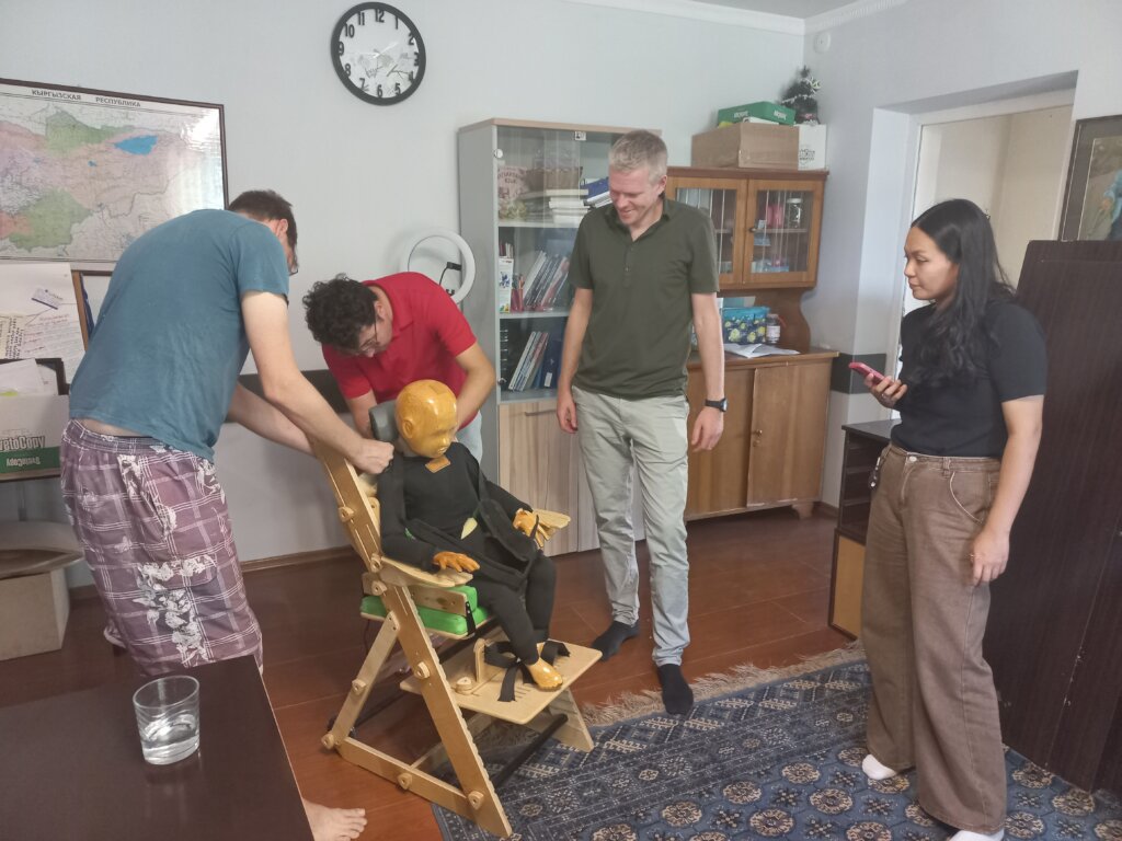 Then we made a surprise trip to Bishkek, Kyrgyzstan — only four hours by car from Almaty. Members of the Almaty Partnership Project for Children with Disabilities met, for the first time with our partners in Bishkek who build professional assistive devices at low cost. It quickly became clear that the two projects complement each other perfectly. Special chairs were loaded up to bring back to Almaty, and all agreed they want to continue learning and cooperating across the border. Peer learning across projects and countries is one of our current strategic goals — so it was wonderful to see it in action!