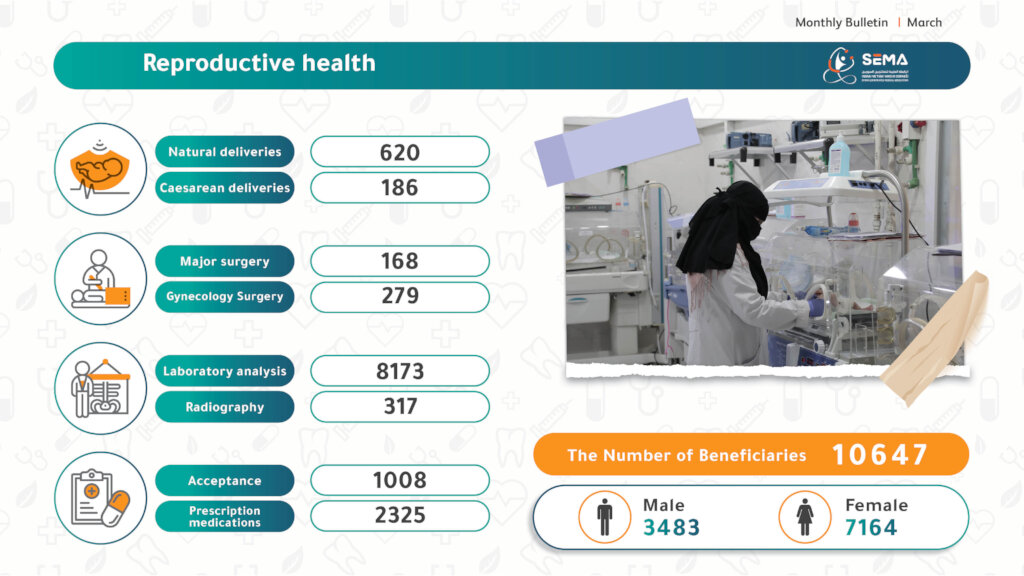 The hospital offers a comprehensive range of free health services, including natural and cesarean deliveries, various gynecological surgeries, neonatal care through medical incubators, as well as radiology, laboratory testing, and medication dispensing.