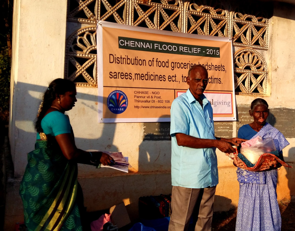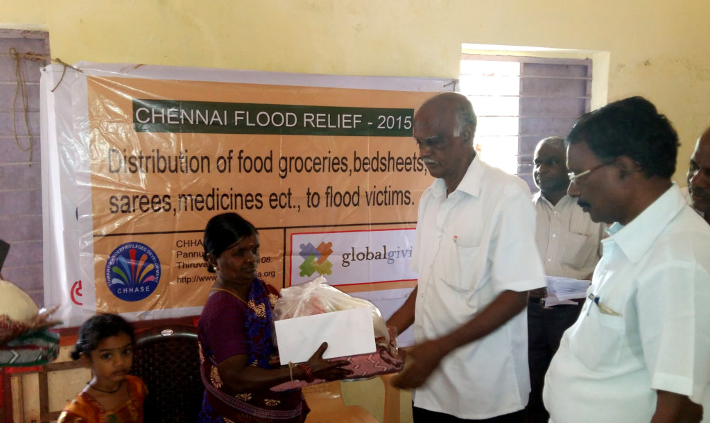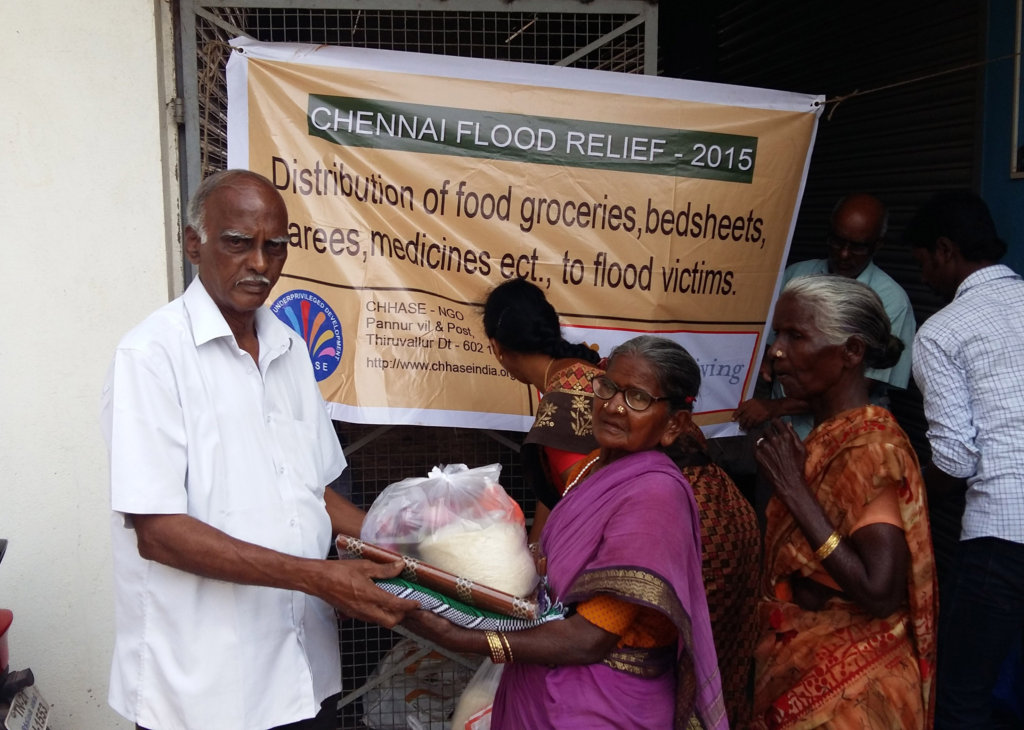 CHHASE has been working in natural calamities for the last 15 years and we are always with our communities for their developments and helping them in critical juncture. As a local NGO, when the floods hit Chennai and it’s suburban, we prepared ourselves to provide immediate relief like food, drinking water, medicines, biscuits and tarpaulins to provide temporary shelter to safe guard them from rains.We operated from our local office, from where we could reach Tiruvallur, kancheepuram and Chennai districts easily.