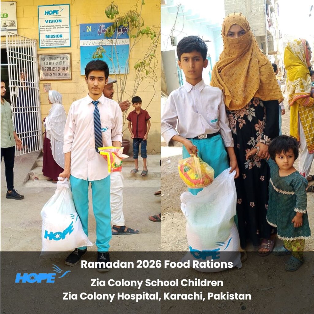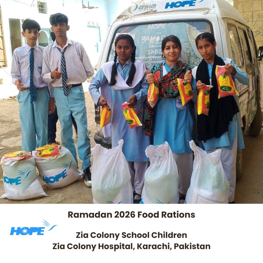 As the month of Ramadan has swiftly entered the last few precious days, the HOPE Team has been working even harder to provide Food Rations to underprivileged families in time for Eid ul Fitr.  This week, 450 students of HOPE's Zia Colony Formal School (catering to an underserved inner city area in Karachi, Pakistan) received Food Rations.  These efforts took place at HOPE's Zia Colony Hospital and were sponsored by the generosity of our donors.