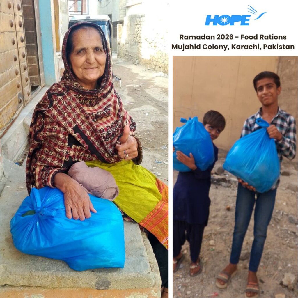 The pictures below represent our initial Food Rations distributions in Ramadan 2026 in Mujahid Colony, Karachi, an urban slum area in which HOPE operates Home Schools, Maternal and Child Health Centers, and Vocational Training programs for the surrounding underserved community.