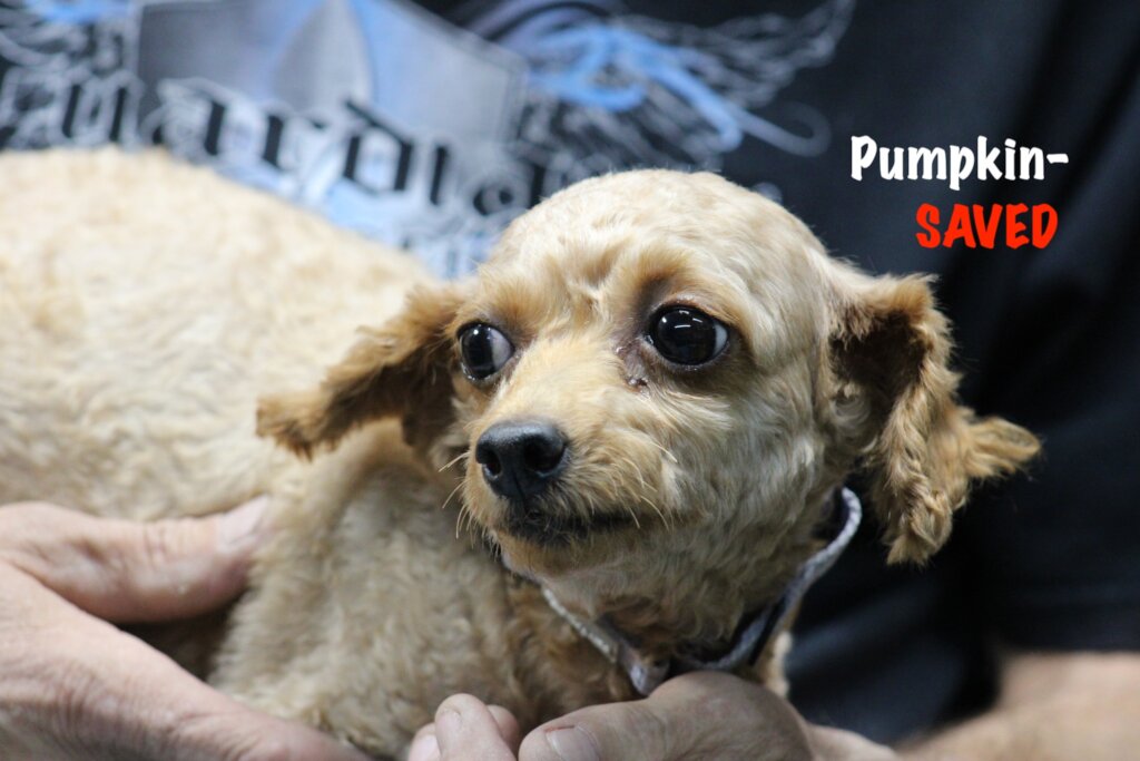 Pumpkin, a miniature poodle, is one of those mothers, and has had her share of puppies. Her tiny frail body trembles in fear at every noise she hears. When we found her, her coat was matted and loaded with fleas and fecal matter. Her toenails were so long they wrapped around her paw, making it hard to stand and walk. She was very dehydrated and underweight. Sick from the untreated intestinal parasites and infection, she haed suffered for a long time.