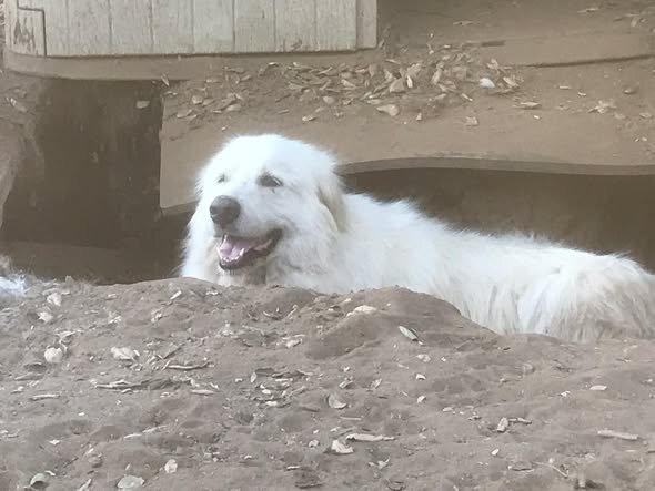 Another great part of Landon’s personality is his love of digging holes. Great Pyrenees are known for digging huge holes. In Landon’s yard, there is a large sleeping hole. This is a second-generation hole. Our beloved Stanley first dug this hole many years ago. Stanley was such a special boy and introduced us not only to Livestock Guardian Dogs, but also the amazing therapy dogs offer in the midst of our sanctuary work.