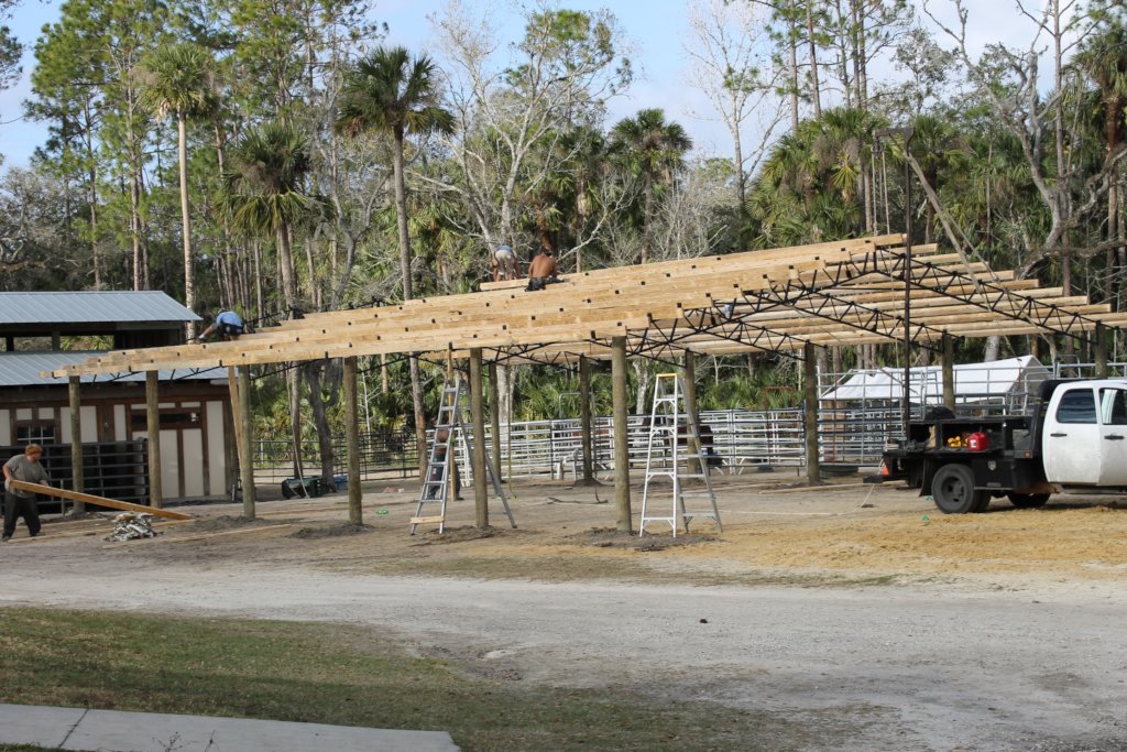 Since moving the center to our new location, three and a half year ago, we have been working towards building permanent barn structures. Finally this dream has come true as GVI Trust fund help with their donation towards our 36’ by 60’ pole barn. This cover will work as shelter for six of our wild horse holding pens. This has been in the works for over six months, we have been getting new pipe corral gates and panels, a new 50’ pipe panel round pen along with added eight dump truck loads of sand. All these improvements really have a wonderful look and change and make working the horses easier. The barn was out up in the same day by Barns Kits of America.