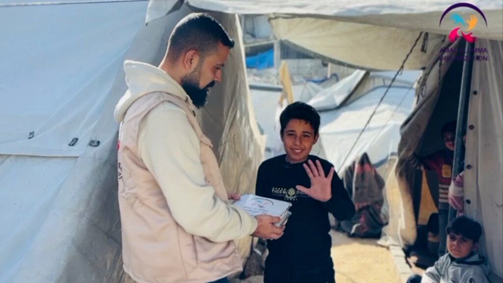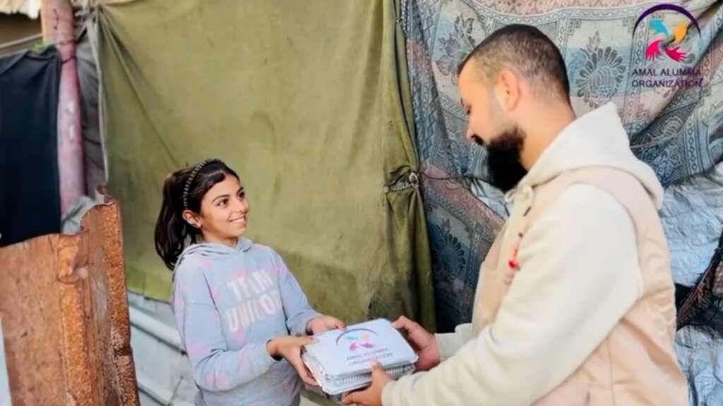 As part of this effort, we distributed hot meals to the family of Mahmoud, who lives with his parents and his sister Fatima in a school shelter after being forced to flee their home.