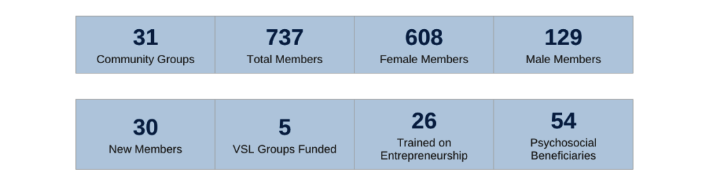 As of February 2026, 31 groups with a combined membership of 737 individuals are actively meeting at the Community Center. Of these members, 608 (82%) are female, and 129 (18%) are male, reflecting the programme's strong emphasis on women's empowerment and inclusion.