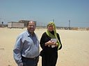 Below is a photograph of Rebuilding Alliance volunteer Kate Gould with UNRWA social worker Khaled Nasrallah, standing in front of the Unity Club soccer field. In the background, you can see the portable unit the Rebuilding Alliance helped build to launch the Yebna Charitable Society community center.