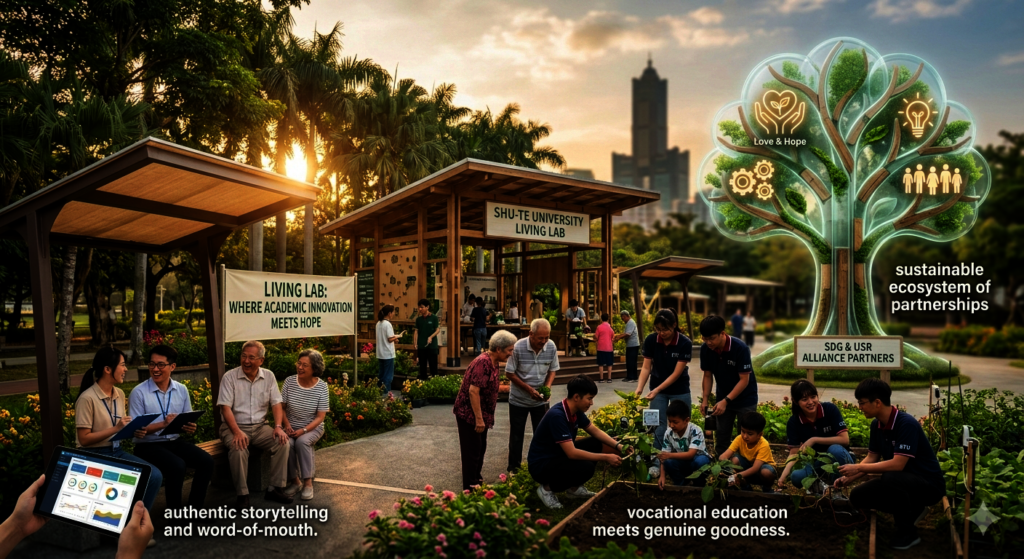 "This concept paper outlines an innovative approach to advancing University Social Responsibility (USR) through a Living Lab partnership. It leverages the interdisciplinary expertise of Shu-Te University’s College of Applied Social Sciences and College of Informatics to develop and implement initiatives aligned with the United Nations Sustainable Development Goals (UNSDGs). Specifically, this paper discusses how the Living Lab can potentially enable collaboration, technological innovation, and applied social sciences research that: a) equips students and faculty with relevant skills, b) strengthens Shu-Te University’s institutional reputation, and c) supports a non-profit organization serving 9 disadvantaged Taiwanese children with severe neurodevelopmental disorders receiving 24/7 residential care and 30 other children and youth with special needs and their families who are classified as belonging to Taiwan’s low-income socioeconomic group. The proposed LH x STU Living Lab has the potential to further strengthen the Taiwan Love and Hope International Charity’s impact on its various service recipients. More importantly, Shu-Te University stakeholders are projected to significantly benefit, as well. Conservative projected estimates using a hypothetical Social Return on Investment (SROI) analysis grounded on a review of relevant literature indicate that for every NT$1 invested in the Living Lab, the SROI ranges from NT$2.30 to NT$4.60, while accounting for deadweight, attribution, and displacement. The projected SROI indicates moderate to high impact potential. The establishment of a Living Lab represents a critical pivot for STU to redefine its brand identity beyond being limited to a vocational university and instead as a force multiplier of social responsibility. In doing so, this paper argues, the rebranding will naturally attract and cultivate a loyal network of partners and supporters invested in sustaining and amplifying the university’s enduring impact."
