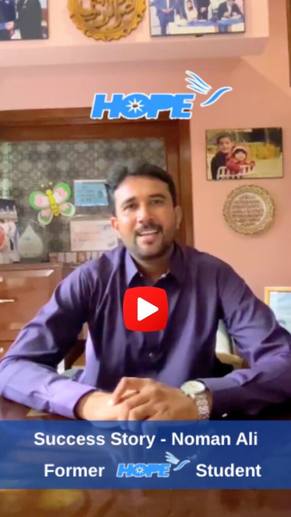 Please enjoy the video testimonial by Noman Ali, a former student of HOPE who grew up in meager surroundings and after attaining an education at HOPE schools - went on to become a vice principal himself.