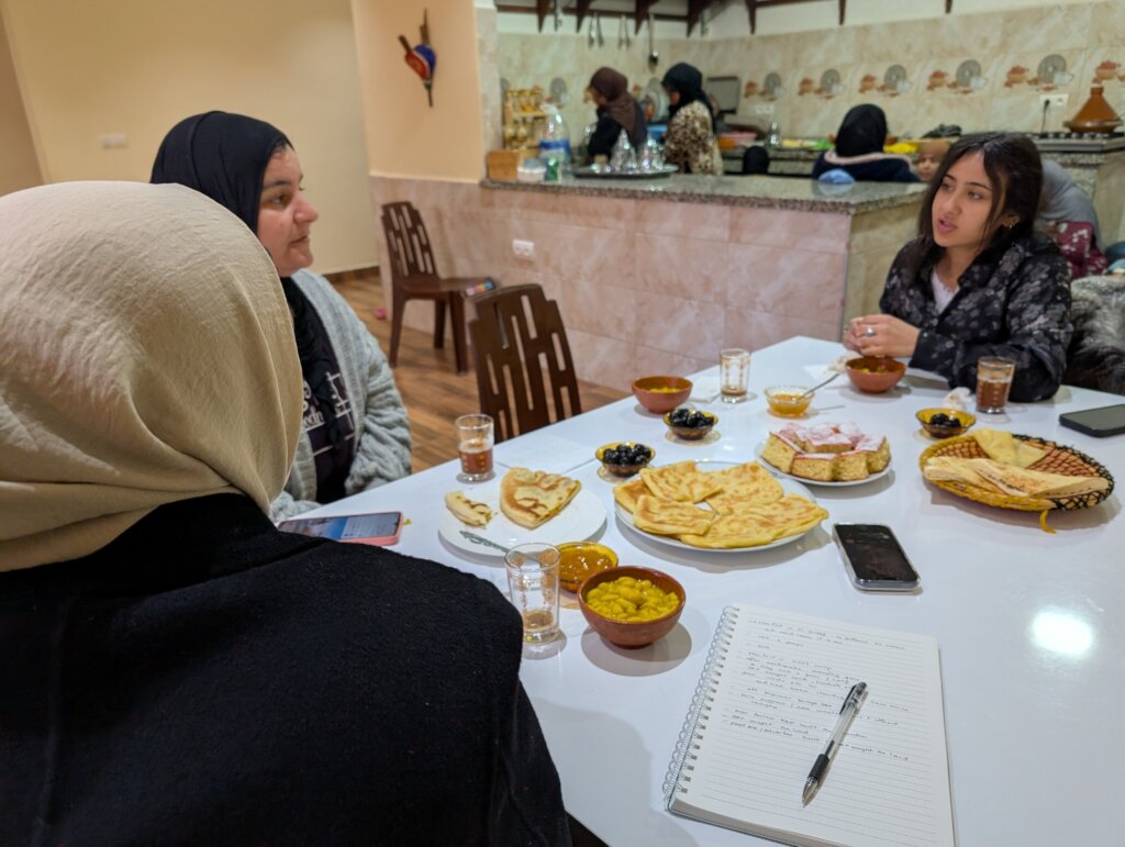Before we began interviews, Samira brought us upstairs to break bread with the women and relax. They were just finishing up with a G Adventures tour group who had been feasting on the msemmen (layered flatbread), khobz (flatbread), orange jam, fresh olives, fried beans, egg omelettes, basbousa cake, and mint tea.