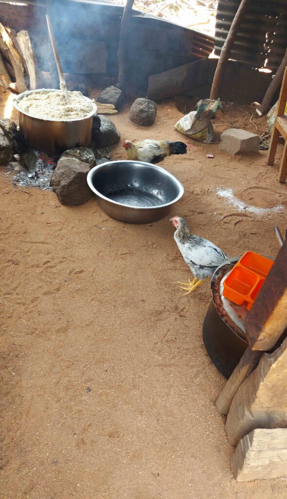 Cooking porridge is usually the job of senior girls who use traditional methods (three stones and fire wood) to make porridge. The smoke from the open fire is often oppressive and harmful.