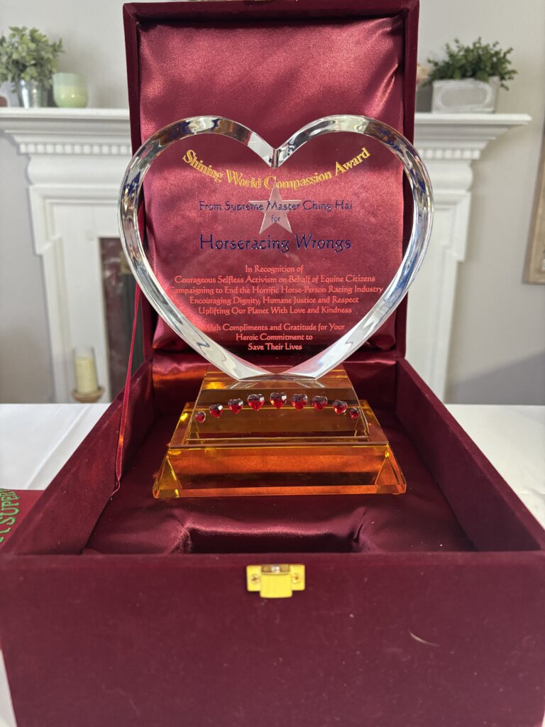 We are honored to share that Horseracing Wrongs received the Shining World Compassion Award from Supreme Master Television in recognition of our work to protect racehorses and expose industry cruelty. Along with this award, we received a $10,000 grant to support our advocacy, investigations, and public education efforts.