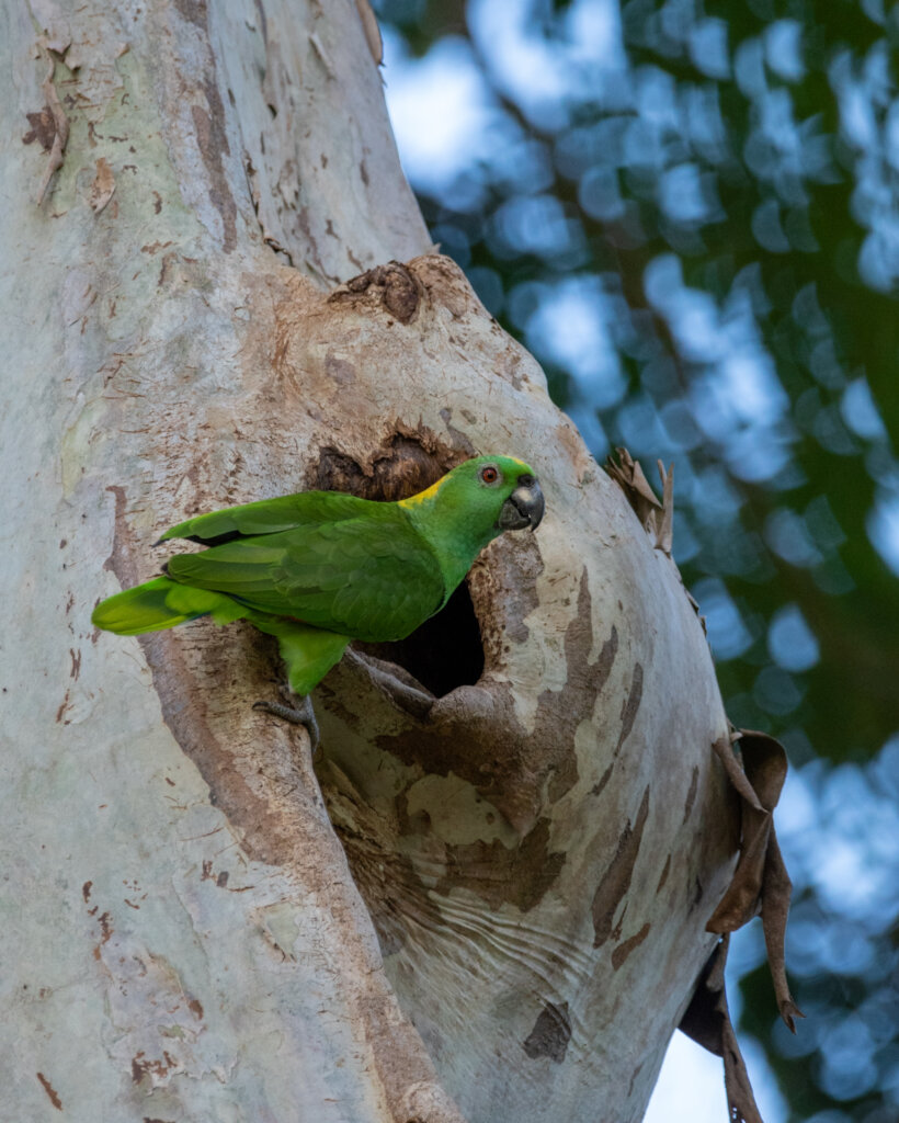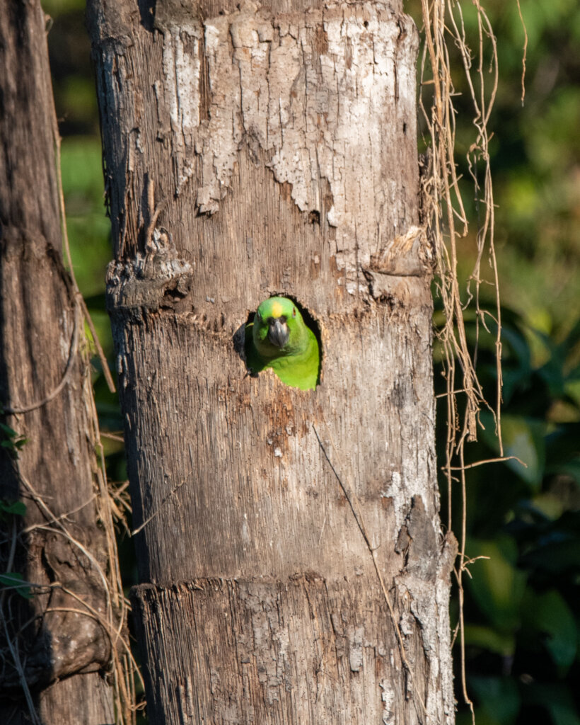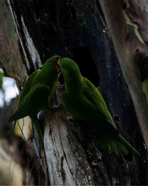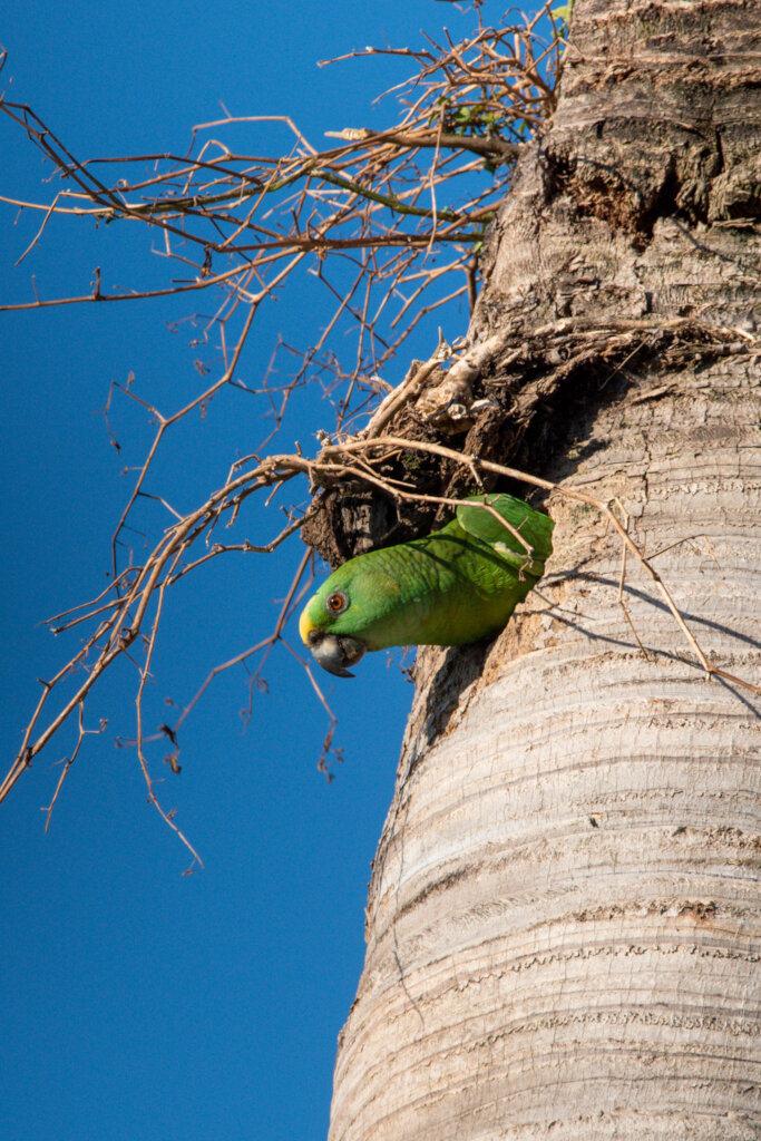 With the growth of the COLORES project, in 2023, we decided to involve the owners and staff of each research hotspot more directly in monitoring the yellow-naped amazons and their nests on their properties. This year, we documented 13 nests and we were able to climb the nesting trees and review 6 of them, of which in 1 (in the ITRA theme park) we found a healthy chick. In 5 of the nests we found evidence that either the nest was abandoned, poached or a predator entered the nest. Given their height and inaccessibility, we have high hopes that the other 7 nests we detected managed to fledge their chicks and contribute to the yellow-naped amazon population on the Pacific coast of Guatemala.