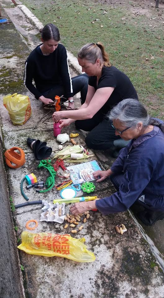 In Chimunshi, our volunteers and staff have been hard at work keeping the Escape Artists happy and healthy. Recently, one of our goals for behavior enrichment is to encourage tool use. Did you know that evidence of chimps using tools dates back to over 4000 years ago? For our escape artists, we encourage them to explore these natural behaviors through enrichment puzzles. In the picture you will notice a volunteer attaching a raising board to the enclosure. Chimps are given thin skewer sticks to push raisins or peanut butter through the holes and onto the other side. Currently, Milla and Cleo can push the raisins through using sticks but haven't quite gotten the idea of catching them on the other side!