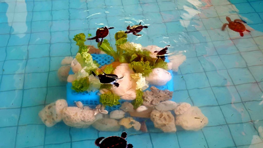 One of the major focuses for our conservation projects here in Phang Nga is working with our local partners at marine turtle head-start centres. The centres work to rear green turtle hatchlings to an age of between 6 months and 1 year to then release them, by which time they will have a much greater chance of surviving to reach breeding age. We have been focusing heavily on our enrichment ideas for the turtles, providing devices which can be placed in the tanks to provide opportunities for the turtles to develop their natural behaviours such as foraging and sheltering from danger.