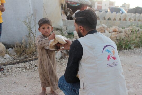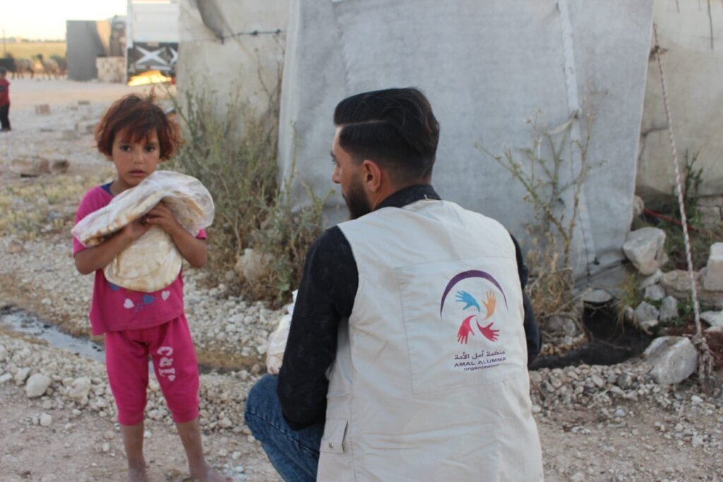Wafa, used to waiting in silence, stood at the entrance of her tent under the morning sun. When she saw our team approaching with fresh bread, her innocent face lit up with joy. She ran toward us as if greeting life itself.