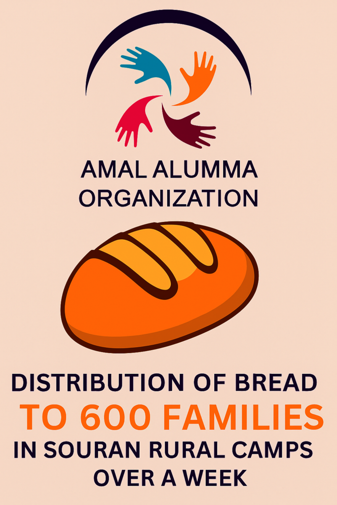 Thanks to your generous and ongoing support, the Amal Al-Umma Organization team was able, over the past week, to distribute bread to 600 displaced families in the rural camps of Suran, northern Syria. These families continue to face difficult humanitarian conditions, with limited resources and rising prices, making the provision of daily bread a real challenge for many of them.