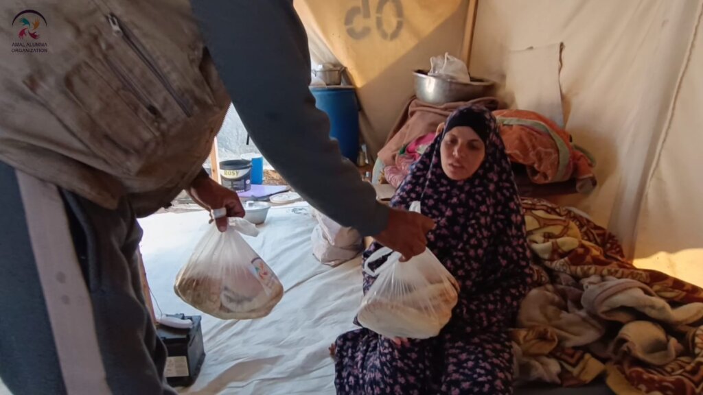 As part of our continuous efforts to support affected families in the Gaza Strip, the organization distributed bread to Mrs. Khadija, who lives in Al-Malaab Camp in northern Gaza. Mrs. Khadija lost her husband, a martyr, during the recent aggression on Gaza and struggles to provide basic needs for her three children. Like many Palestinian families, she faces severe humanitarian conditions, especially as winter sets in and needs grow.