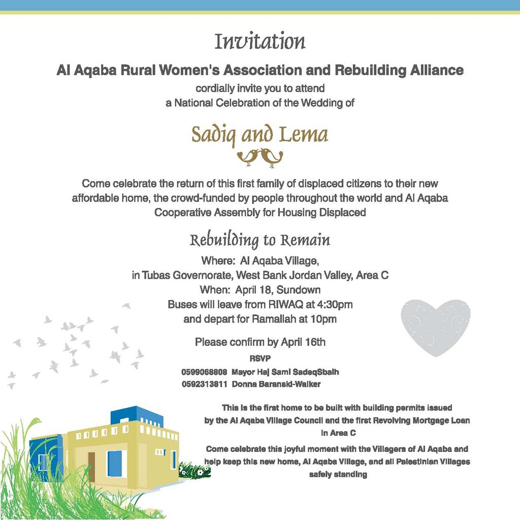 Mayor Haj Sami invites you to this the National Wedding of Sadiq and Lema on the 18th. In the invitation, he wrote, "Come celebrate the return of this first family of displaced citizens to their new affordable home, crowd-funded by people around the world (that's you!) and the Al Aqaba Cooperative Assembly for Housing Displaced."
