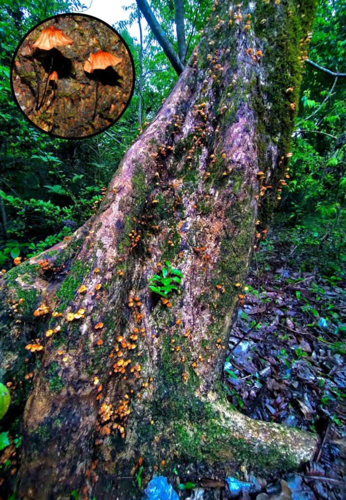 The entire trunk of the tree was covered in thousands of tiny orange mushrooms identified as Marasmius leveilleanus. The mass blooming of this mushroom, forming a spectacular carpet of life climbing up the tree's weathered bark. It was a rare natural event—like watching a hidden world reveal itself in full glory. This single tree, towering and aged, had transformed into a vertical habitat, supporting not just the mushroom bloom but mosses, lichens, insects, and even tiny seedlings clinging to life in crevices of the bark.