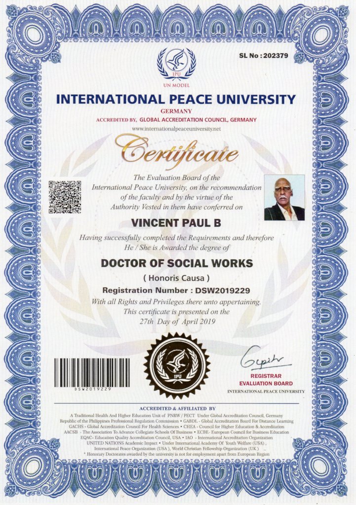 CHHASE and staff are so glad to inform you that Mr.Vincent paul, secretary has been awarded Doctorate for his tireless social work towards Women empowerment, Girls Education, Better Livelihood, Health & environment by International peace university, Stuttgart, Germany. This doctorate made possible because of the support of all respectable donors and supporters along with the dedicated performance of CHHASE team.