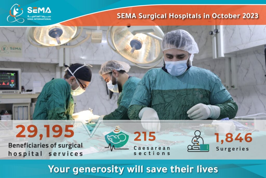 Last Month, there are 2,060 patients who have recovered after receiving free surgery at SEMA Hospitals in northern Syria, including 215 mothers and newborns who underwent safe cesarean section deliveries. These individuals could not afford the expenses of surgical procedures in private hospitals.