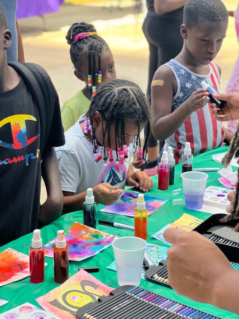 The featured photo highlights a visual art activity led by Innovation and Partnerships Director, Danyett Tucker, at a community event hosted by the Latin American Youth Center.