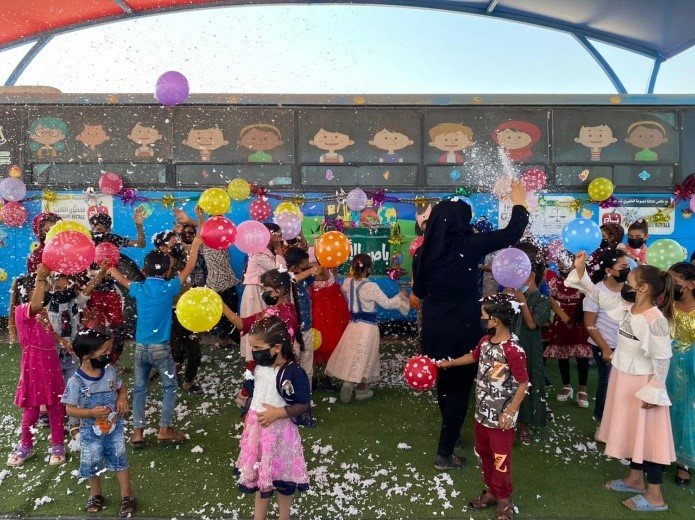 Sometimes pictures say it all! This old, city bus got a brand new life as a coloful classroom with learning, lunch, fun games, arts and crafts and lots of emotional, social, and health care. If buses could smile, this one would!