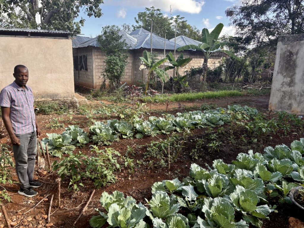 To help farmers deal with pests, agronomist Balaguel is teaching the use of a homemade natural insecticide, made from locally available ingredients. This low-cost, environmentally safe solution protects crops such as cabbage from insect damage.