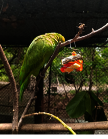 Upon arrival, they were checked by our clinical team, most of them had a low body condition, we took immediate action to improve their diet and improve their general condition. They also had evidence of boredom (they pluck their feathers), so we designed enrichment elements to improve their psychological wellbeing. The group is housed together with other parrots in a 12mts x 12mts x 7mts aviary, much more comfortable than their previous life.