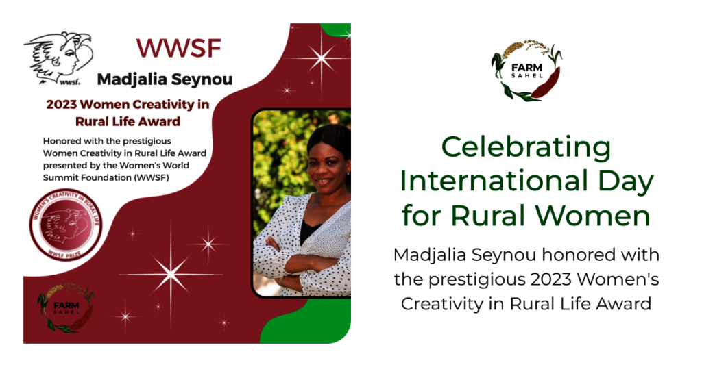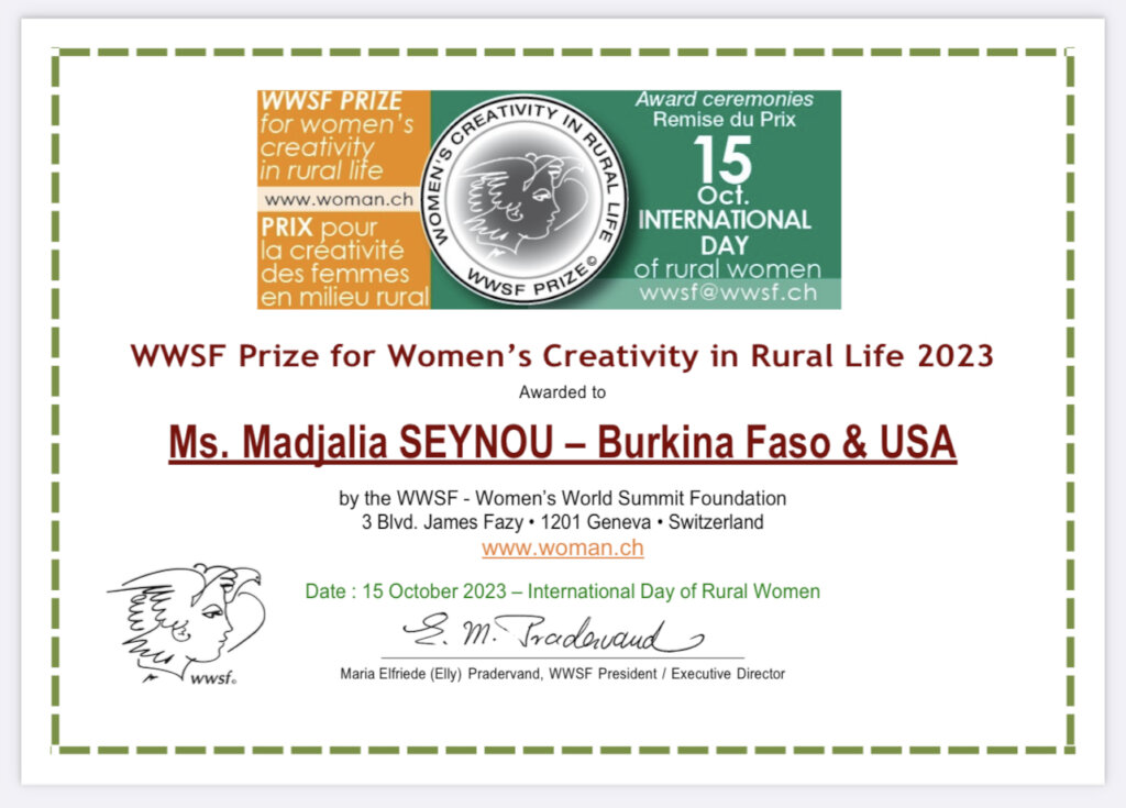 We are overjoyed to share the outstanding news that Madjalia Seynou, our esteemed Executive Director, has been honored with the prestigious 2023 Women Creativity in Rural Life Award by the Women’s World Summit Foundation (WWSF) in Switzerland. This remarkable recognition underscores Madjalia's extraordinary leadership and her relentless commitment to the cause of sustainable rural development.