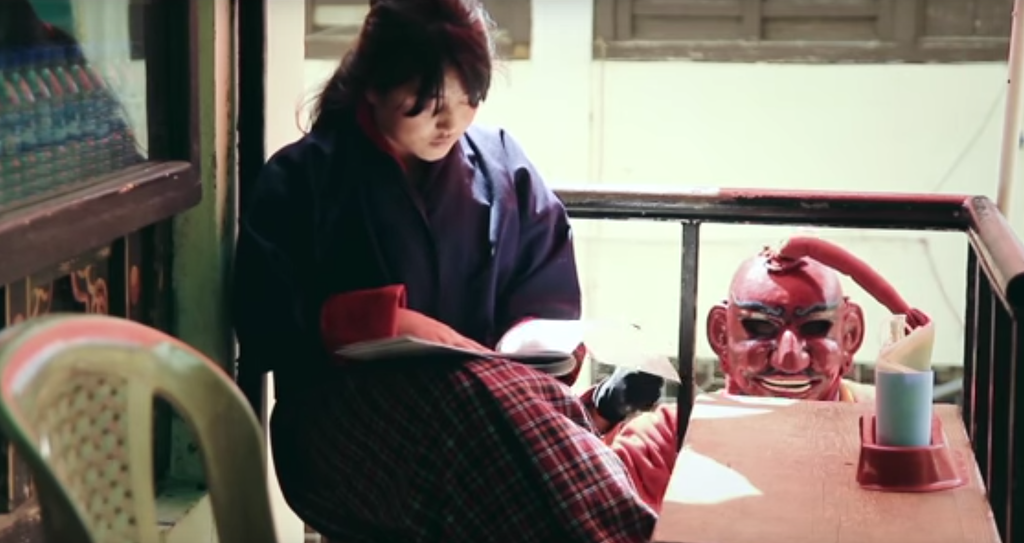 In the video, an Atsara goes around different places in Thimphu town carrying books and distributing to the public for free. The atsara represents a Buddhist master who has mastered Buddhism and therefore seeks to challenge the conventional wisdom of society. The word 'atsara' is derived from the Sanskrit word acharya which means 'the accomplished one'.